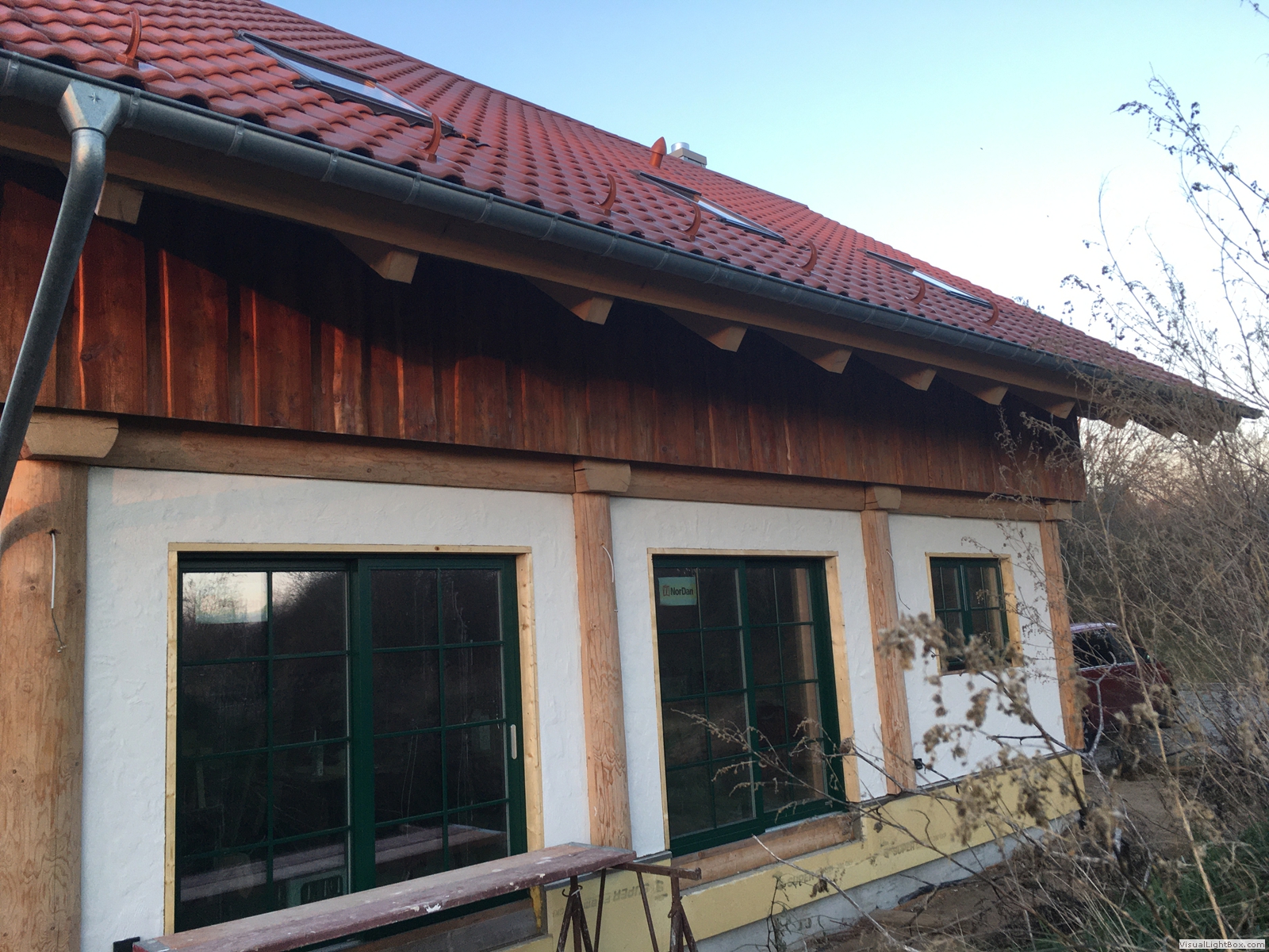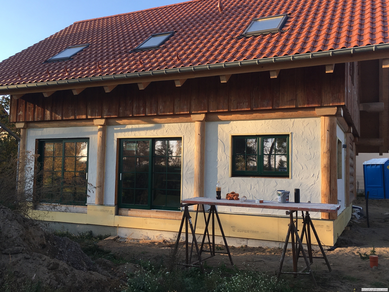 Ab Oktober folgten zahlreiche weitere Arbeiten: die äußeren Laibungen, der Einbau der (Bau-)Treppe, die inneren Fensterbänke und Laibungen, der Türeneinbau, diverse Installationen sowie die Fliesenarbeiten im Bad. Hinzu kamen das Verlegen des Laminats, Tapezier- und Malerarbeiten – und nicht zuletzt eine schier erschlagende Menge an Außenarbeiten.