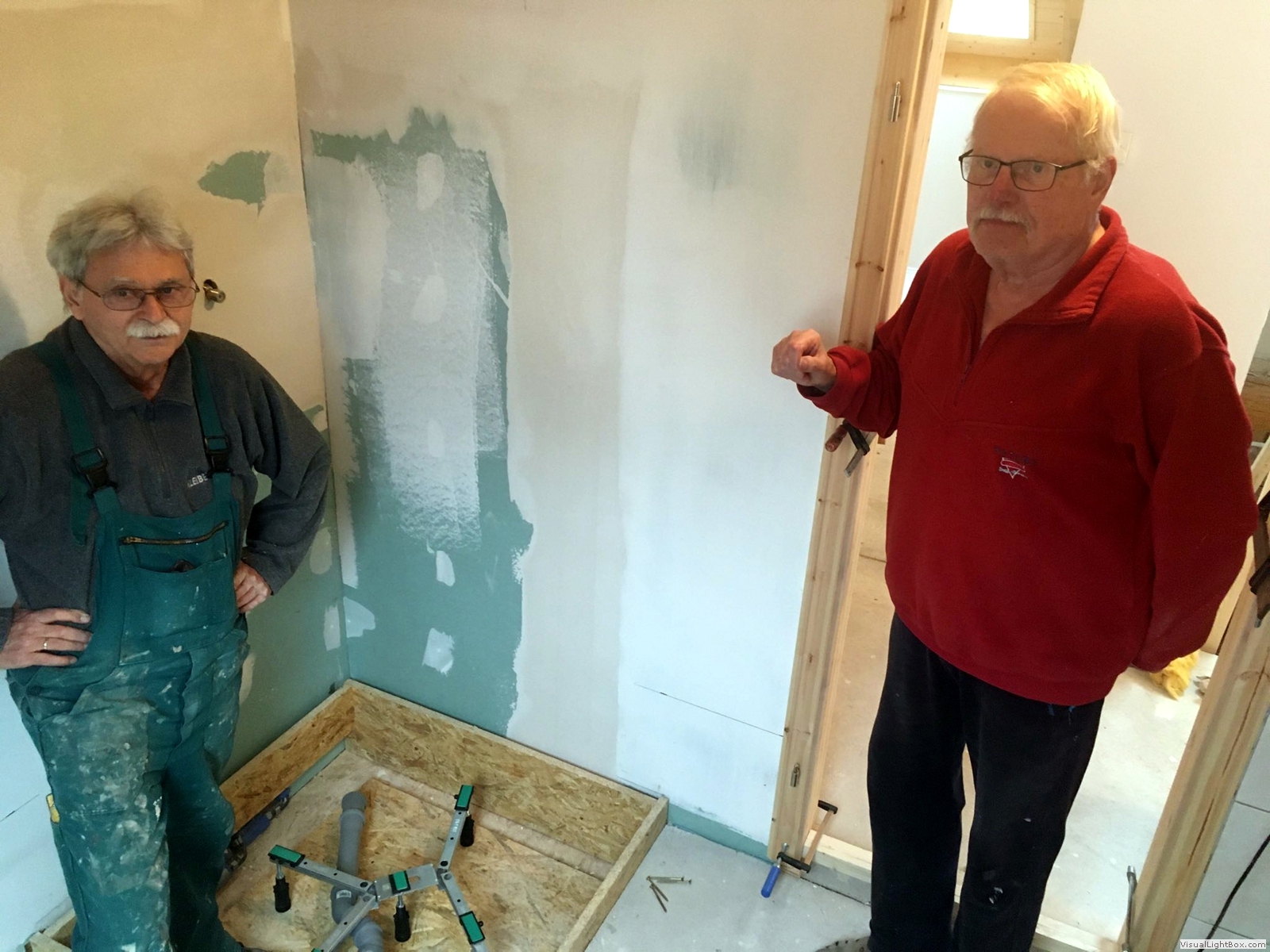 Die beiden fleißigen »Oppas« montieren das Duschbecken
